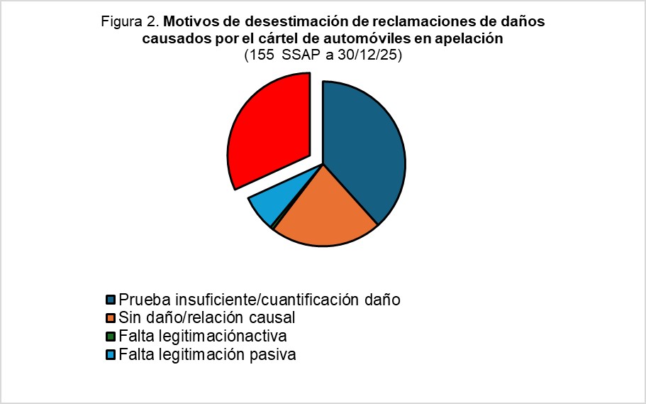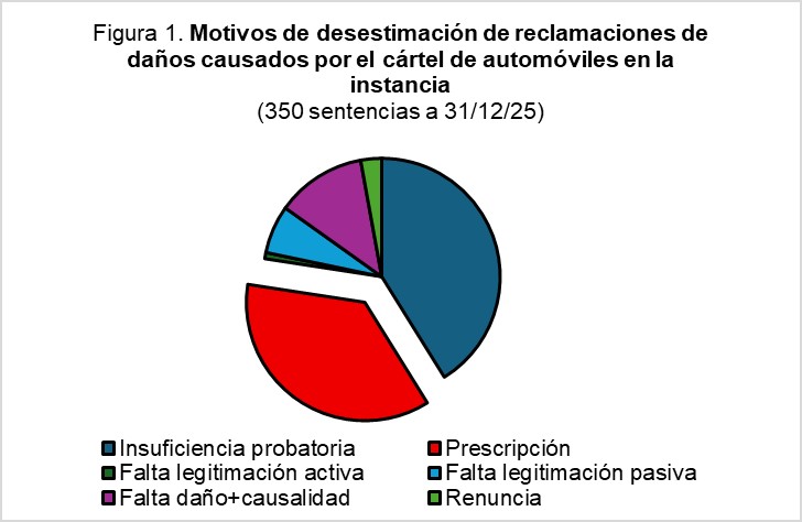 La prescripción es un argumento de defensa perenne, utilizado muchas veces por los demandados con poca fundamentación. Con todo, es motivo de desestimación acogido con frecuencia por los tribunales. En las reclamaciones de daños por el cártel de automóviles la prescripción es, tras la insuficiencia probatoria del quantum del daño, el segundo motivo de desestimación de las pretensiones por los tribunales, tanto en la instancia (Figura 1, 36%) como en la apelación (Figura 2, 32%).